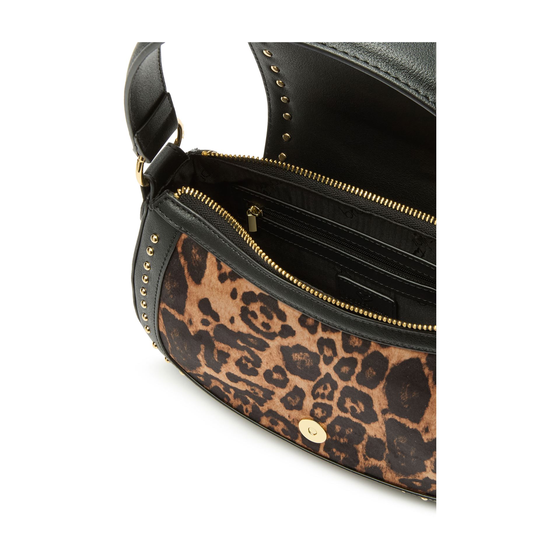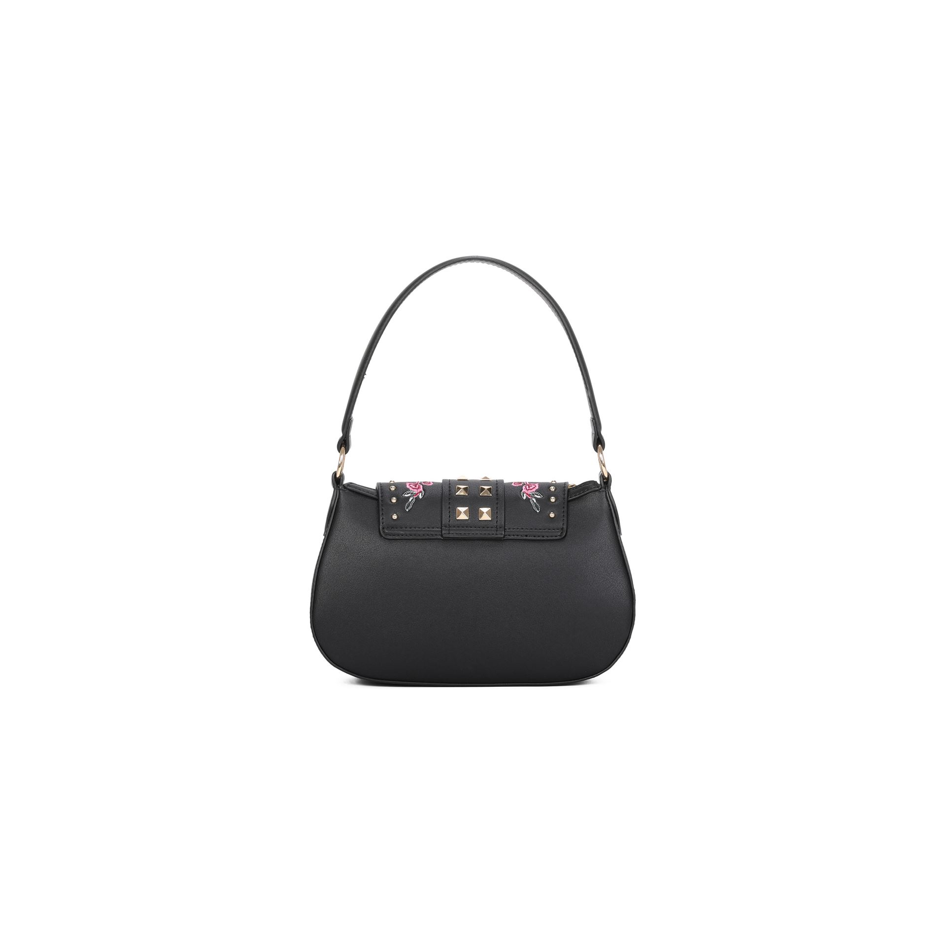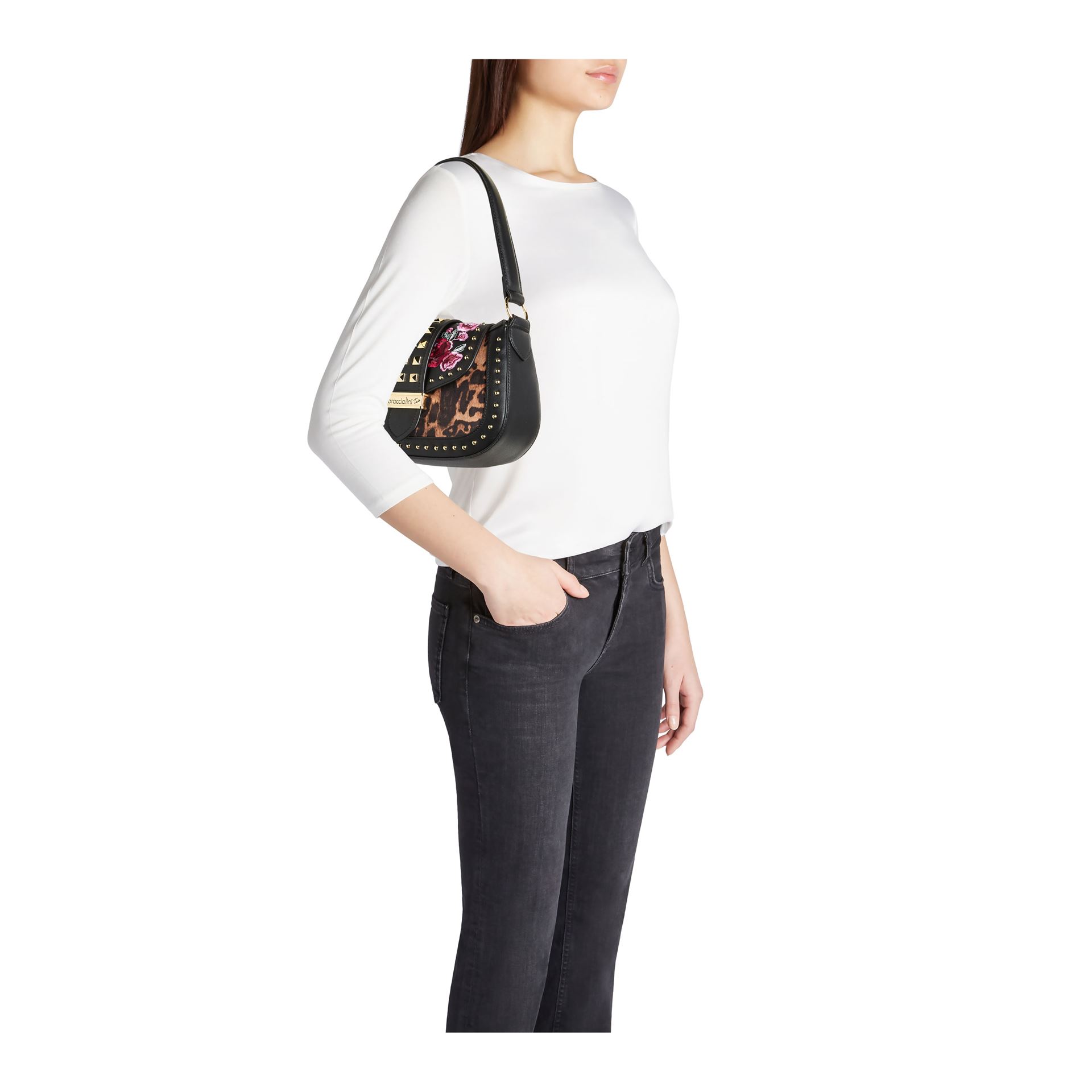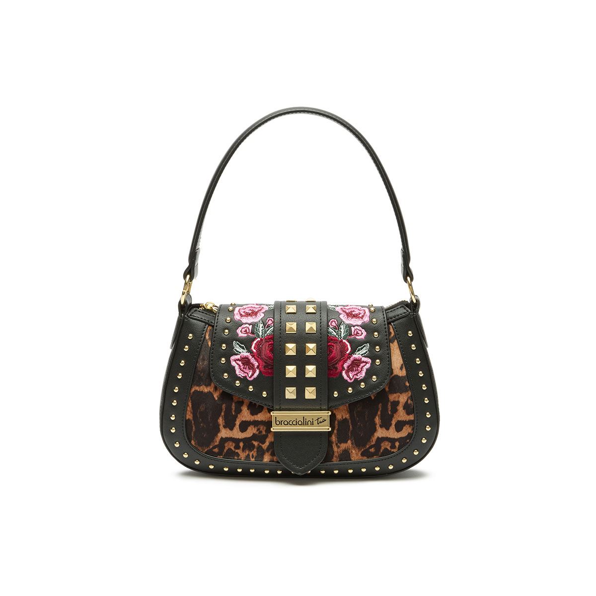 Μαύρη τσάντα hobo από συνθετικό δέρμα, διακοσμημένη με έναν έντονο συνδυασμό χρυσών καρφιών, ένθετα με animal print σε εφέ πόνυ και κομψά κεντημένα φλοράλ απλικέ σε αποχρώσεις του κόκκινου και του ροζ. Το καπάκι, διακοσμημένο με μια κεντρική λεπτομέρεια με τρουκς, κλείνει με ένα κρυφό κλιπ. Άνετη για να φορεθεί στον ώμο χάρη στην κοντή λαβή, διαθέτει επίσης αφαιρούμενο και ρυθμιζόμενο λουράκι ώμου για καθημερινή ευελιξία. Ένα τολμηρό στυλ που συνδυάζει ροκ ψυχή και έντονη θηλυκότητα.