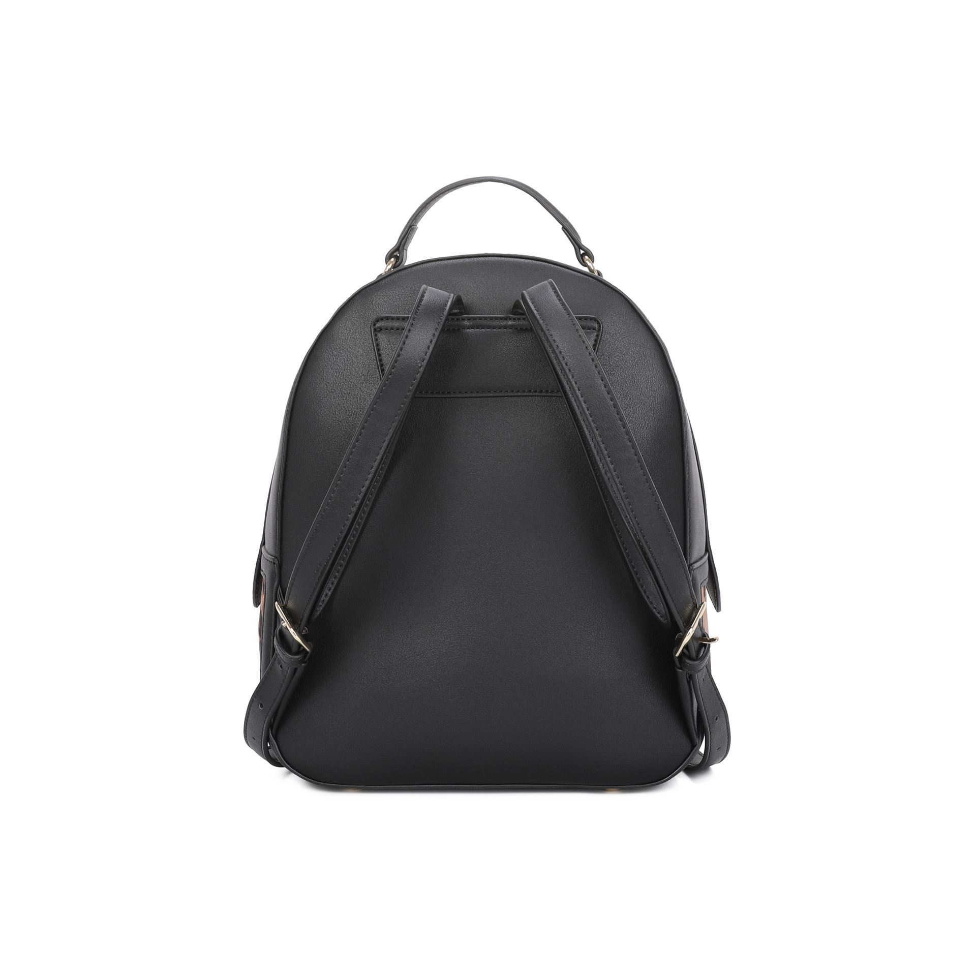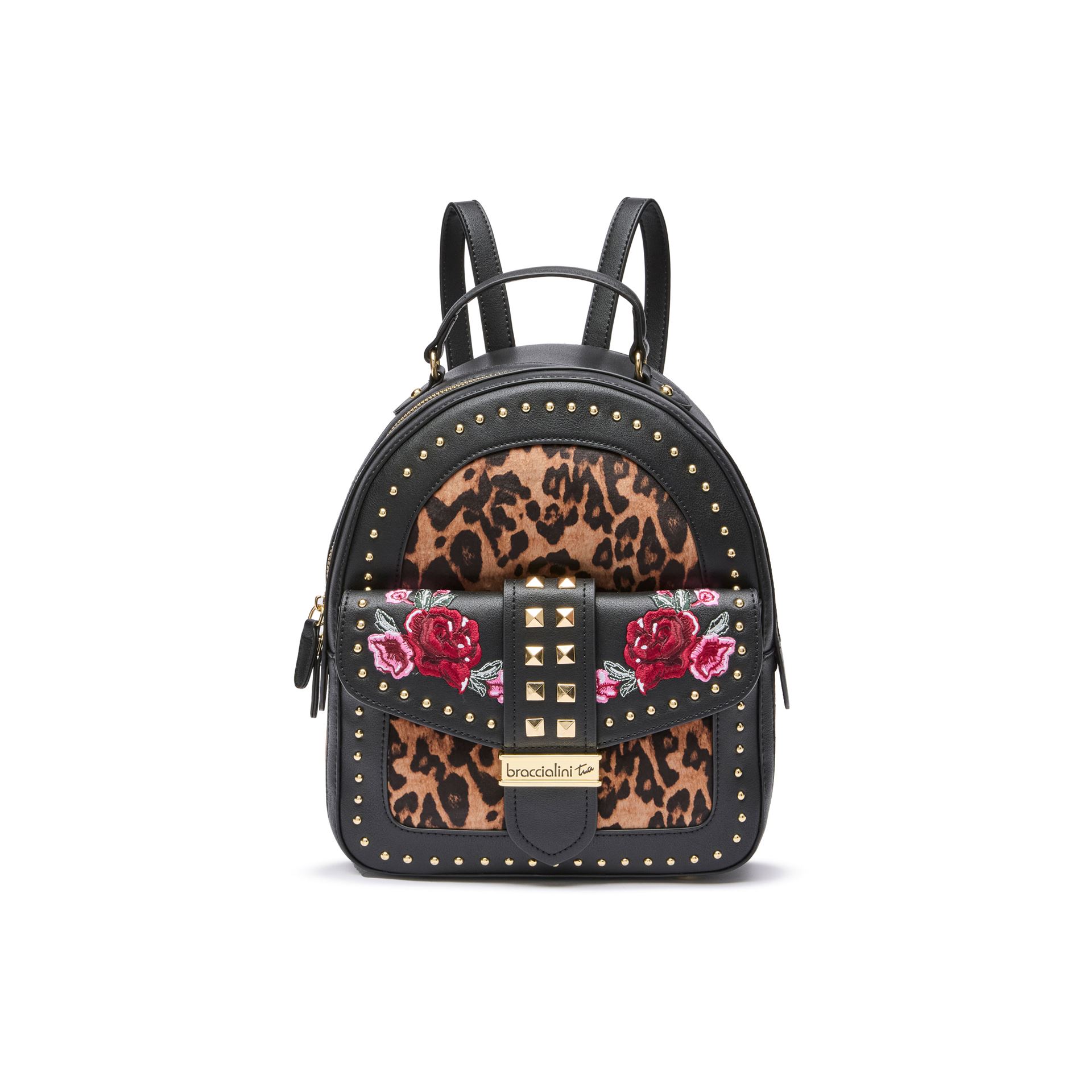 Μικρό, μαύρο σακίδιο πλάτης από συνθετικό δέρμα με μονή λαβή και ρυθμιζόμενα λουράκια ώμου. Το μπροστινό καπάκι, διακοσμημένο με χρυσά καρφιά, μεταλλικά απλικέ και φλοράλ κέντημα, συνδυάζεται με το κεντρικό πάνελ με εφέ animalier για μια έντονη και εντυπωσιακή εμφάνιση. Άνετο και πρακτικό, είναι ιδανικό για να προσθέσετε μια πινελιά προσωπικότητας στα καθημερινά αστικά ρούχα. ΛΕΠΤΟΜΕΡΕΙΕΣ Γραμμή: Rock Υλικό: Polysynth Εσωτερικό τσάντας: Μία τσέπη για κινητό και μία μπροστινή τσέπη Κλείσιμο: Φερμουάρ Χρώμα: Μαύρο Διαστάσεις: 24cm x 30cm x 11,5cm