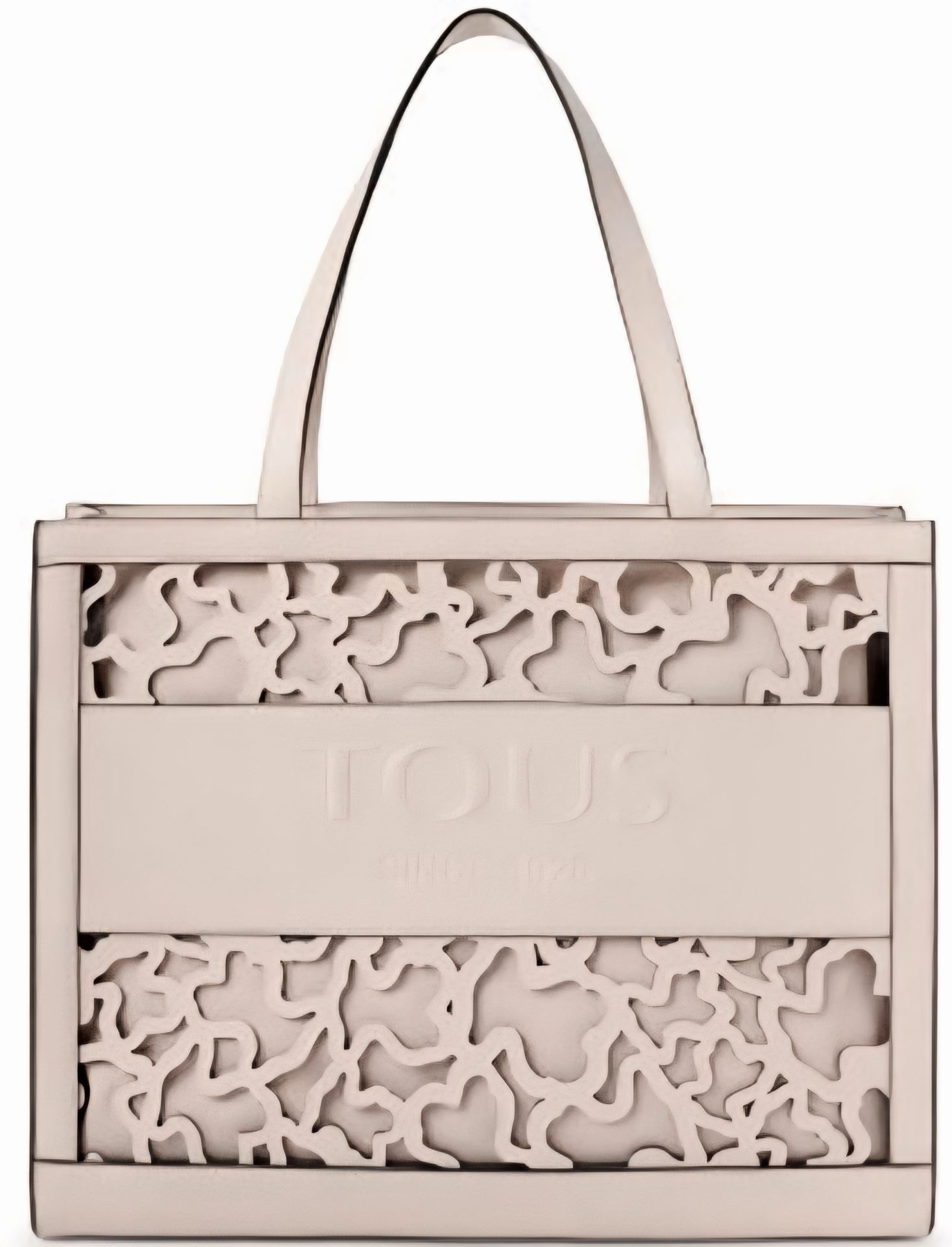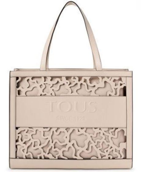 Μεγάλη τσάντα για ψώνια TOUS της συλλογής Amaya Kaos Shock από καφέ βινύλιο με εφέ δέρματος. Μακριά λουράκια ώμου. Έχει πρες μπουτόν για ενσωμάτωση της τσάντας Amaya Kaos Shock..