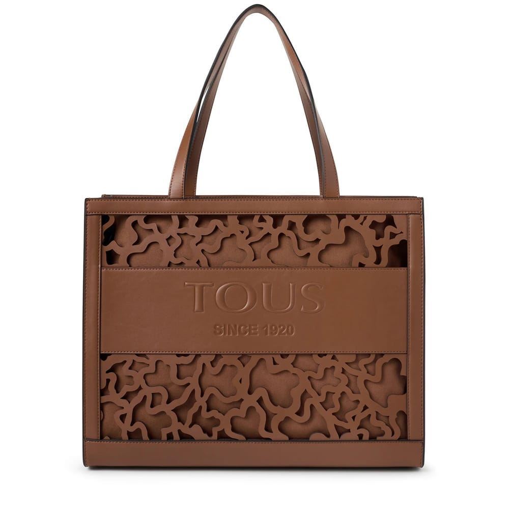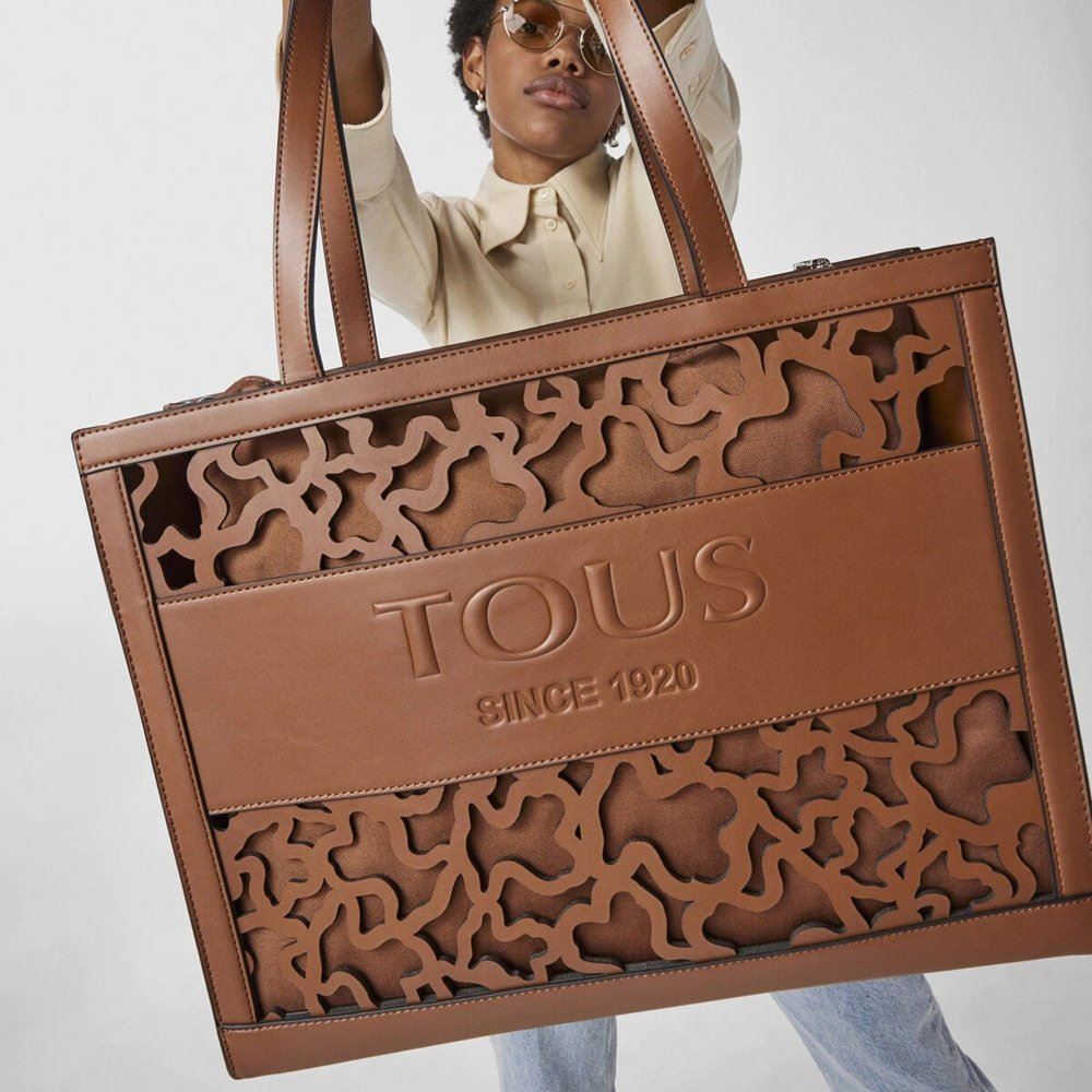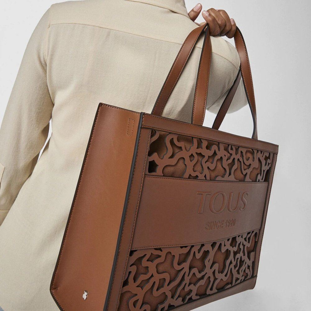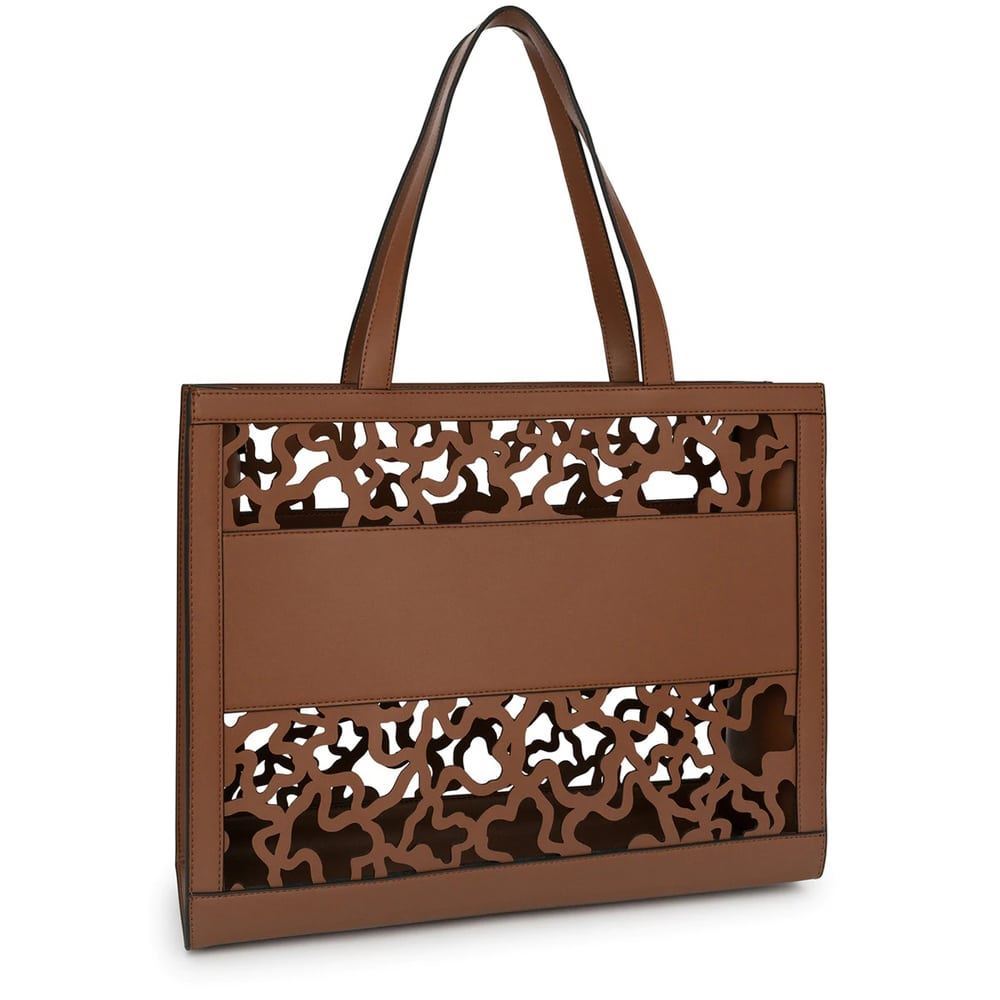 Μεγάλη τσάντα για ψώνια TOUS της συλλογής Amaya Kaos Shock από καφέ βινύλιο με εφέ δέρματος. Μακριά λουράκια ώμου. Έχει πρες μπουτόν για ενσωμάτωση της τσάντας Amaya Kaos Shock..