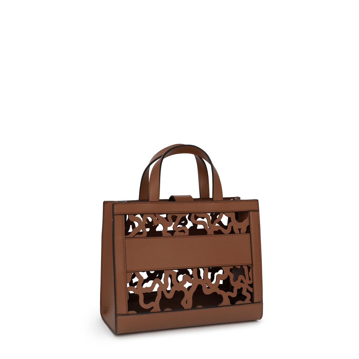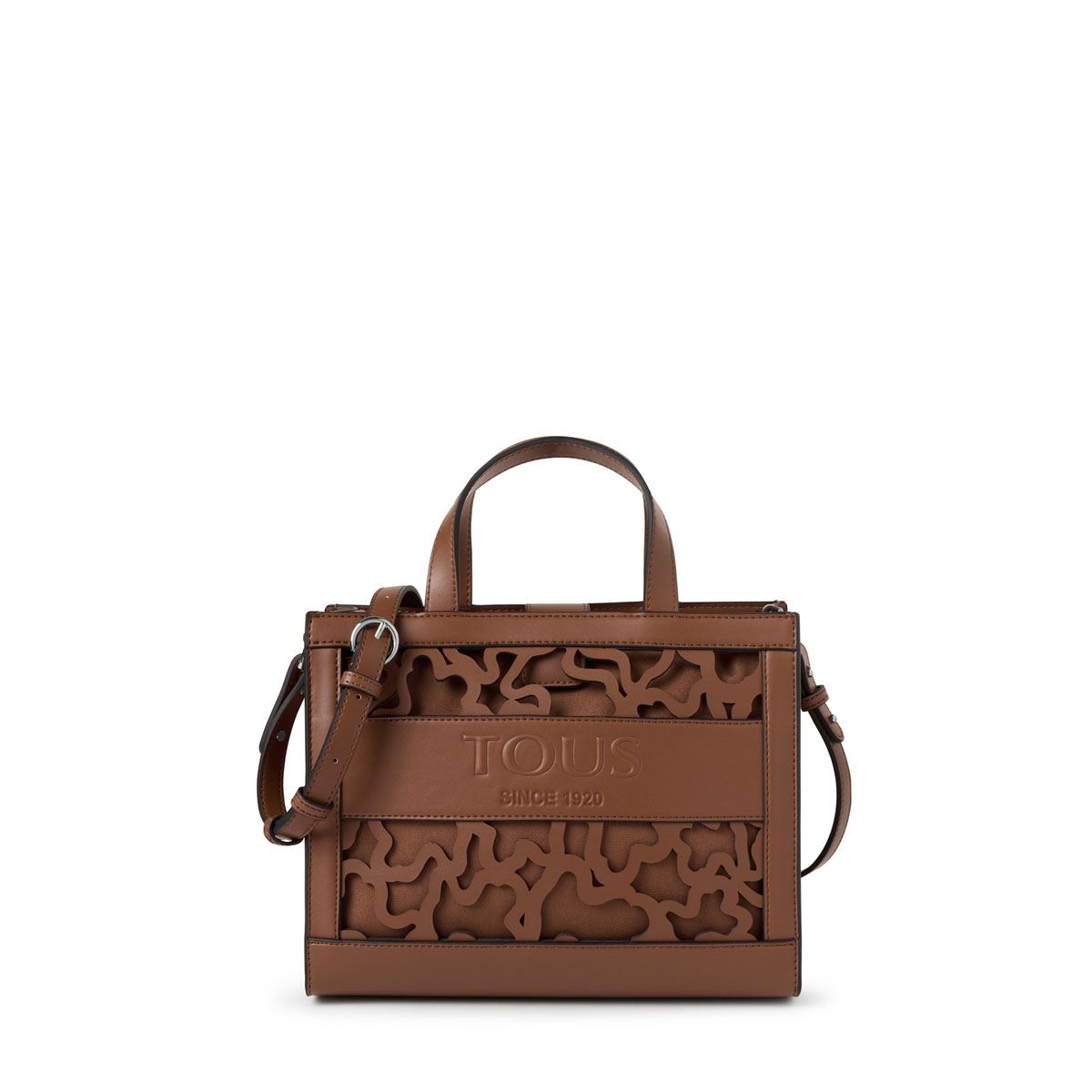 Μεσαία τσάντα tote χιαστή TOUS της συλλογής Amaya Kaos Shock από καφέ βινύλιο με εφέ δέρματος. Μακρύ λουράκι χιαστή. Έχει πρες μπουτόν για ενσωμάτωση της τσάντας Amaya Kaos Shock..